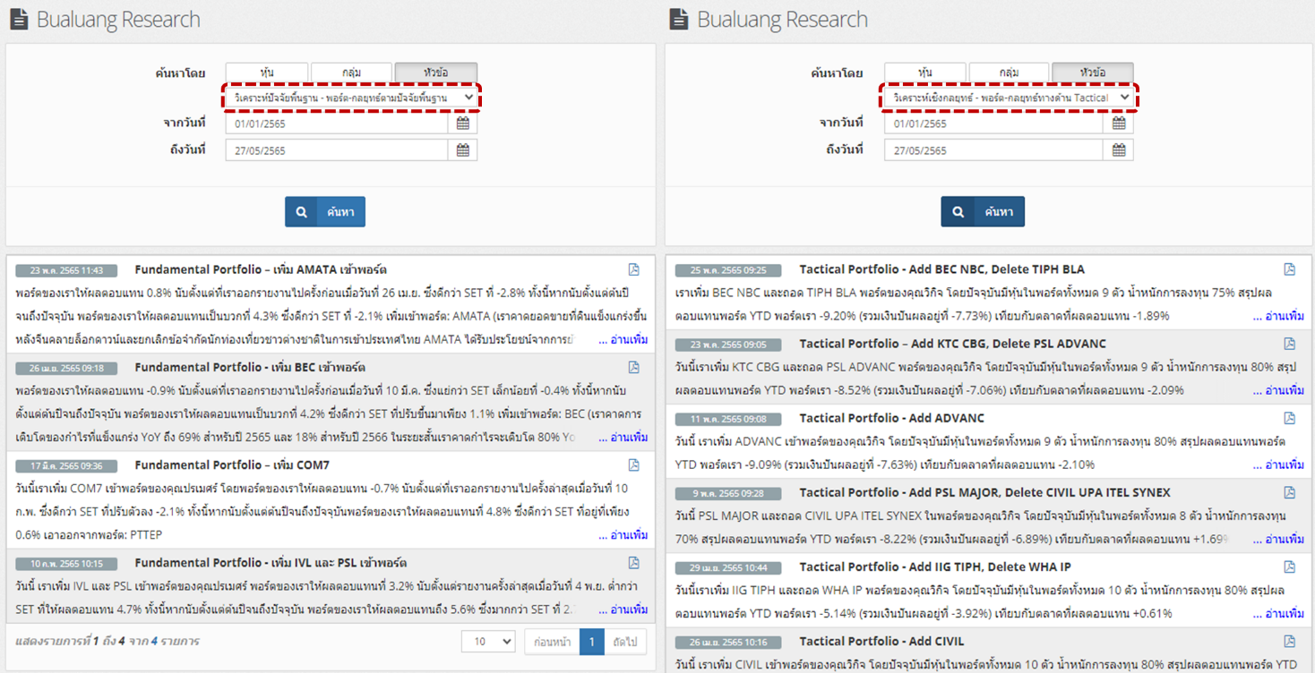 - ทางหลักทรัพย์บัวหลวงมีการติดตามคำแนะนำของนักวิเคราะห์ และมีการบันทึกผลการลงทุนมาต่อเนื่องมากกว่า 4 ปี ซึ่งพิสูจน์แล้วกับผลตอบแทนของพอร์ตการลงทุนที่ทำได้ดีกว่าตลาด จึงนำมาสู่บริการบริหารพอร์ตการลงทุนอัตโนมัติตามแบบฉบับนักวิเคราะห์ Model Portfolio