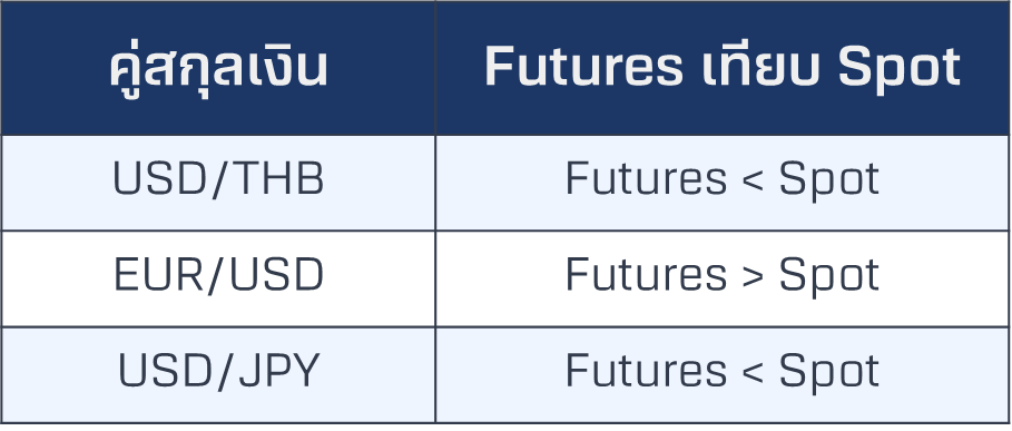 ราคาของ EURUSD Futures อยู่สูงกว่าราคาสปอต เนื่องจากสกุลเงินฐาน (Base Currency) เป็นสกุลเงินยูโร ซึ่งอัตราดอกเบี้ยในยูโรโซน ณ ปัจจุบันอยู่ต่ำกว่าอัตราดอกเบี้ยของสหรัฐฯ และถือเป็นคู่สกุลเงินเดียวในตลาด TFEX ที่มีสกุลเงินฐานไม่ใช่สกุลเงินดอลลาร์