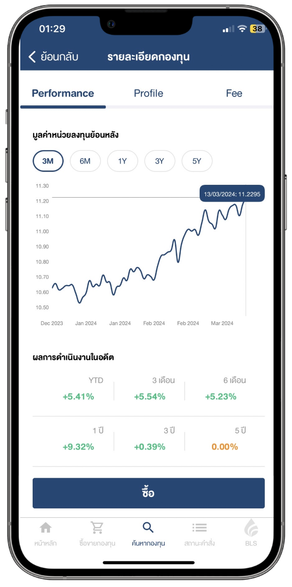 ศึกษาข้อมูลกองทุนรวมก่อนลงทุน โดยคลิกดูข้อมูลกองทุนที่ต้องการ บนเมนู Performance จะแสดงผลตอบแทนย้อนหลังและค่าความผันผวน, เมนู Profile แสดงรายละเอียดกองทุนต่างๆ, เมนู Fee ใช้ดูค่าธรรมเนียมการซื้อขายต่างๆ ของกองทุน