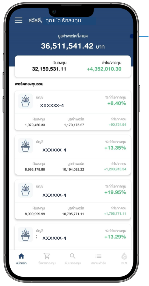 หน้าหลักบนแอป Streaming Fund+ แสดงข้อมูลบัญชีกองทุนรวม ได้แก่ เลขที่บัญชีของกองทุนรวม, %กำไร/ขาดทุน, กำไร/ขาดทุน, เงินลงทุน, มูลค่าพอร์ต