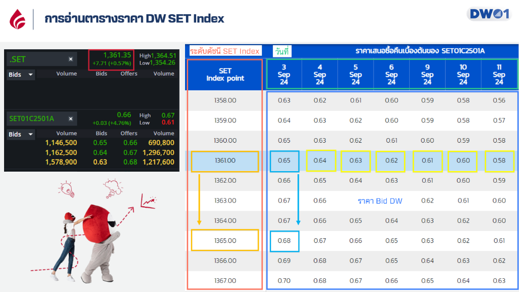 - นักลงทุนสามารถทราบราคา Bid DW เมื่อเทียบกับระดับของดัชนี SET ได้ ยกตัวอย่างเช่น ในวันที่ 3 ก.ย. 67 ดัชนี SET อยู่ที่ 1,361.35 จุด (กรอบสีส้ม) ราคา DW SET เท่ากับ ราคา BID 0.65 บาท (กรอบสีฟ้า)