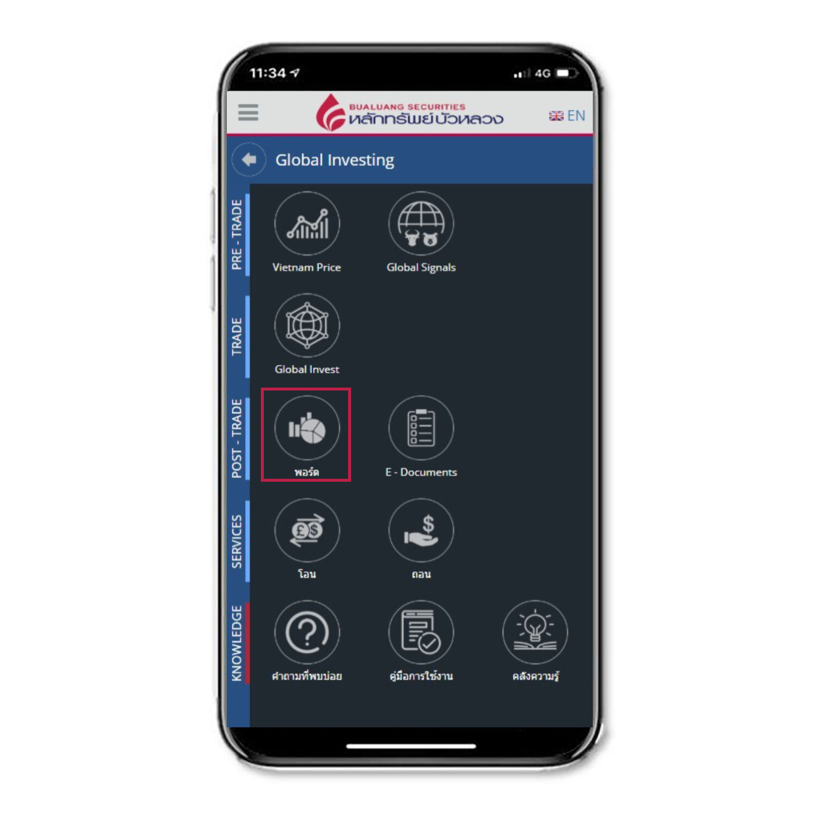 ตรวจสอบพอร์ตลงทุน และรวมพอร์ตการลงทุนทุกสินทรัพย์ เพื่อบริหารจัดการลงทุนง่ายแค่ปลายนิ้ว!! สำหรับตลาดหุ้นสหรัฐอเมริกาและตลาดหุ้นฮ่องกง สามารถตรวจสอบพอร์ตลงทุนต่างประเทศของท่านผ่านระบบซื้อขาย "Global Invest" ไปที่เมนู "Positions" หุ้นที่ถือครองอยู่ในพอร์ต ระบบจะแสดงหน้าพอร์ตการลงทุนของท่านสำหรับตลาดหุ้น UK / HK