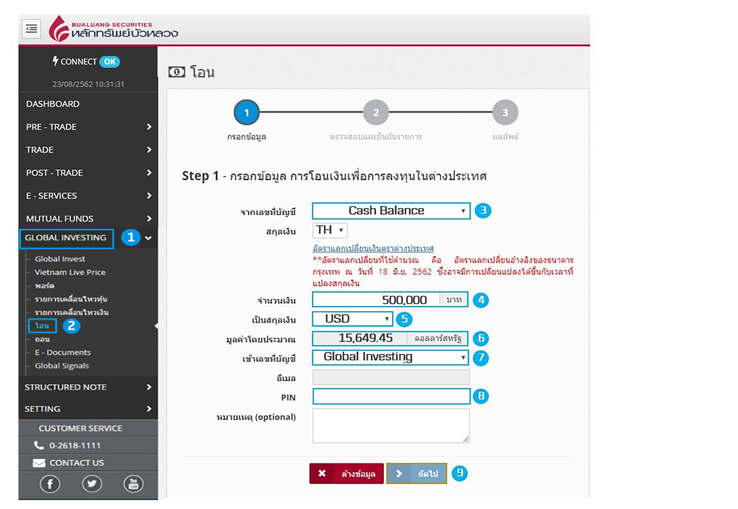 ขั้นตอนที่ 1 : Login เข้าสู่เว็บไซต์ www.bualuang.co.th โดยระบุ Username และ Password Username : เลขที่บัญชี 6 หลัก Password : รหัสผ่าน 1. เลือกเมนูหลัก Global Investing 2. เลือกเมนูย่อย “โอน” 3. เลือกบัญชีต้นทางที่มีเงินไทยบาทจากบัญชี Cash collateral หรือ Cash Balance ก็ได้และเลือกสกุลเงินเป็น TH (ไทยบาท) 4. ระบุจำนวนเงินที่ต้องการแลกเปลี่ยนเป็นสกุลเงินต่างประเทศ *โดยก่อนส่งคำสั่งโอนเงิน นักลงทุนต้องมีเงินไทยบาทในบัญชี Cash collateral หรือ Cash Balance แล้วจึงส่งคำสั่งโอนเงินไปยังบัญชีต่างประเทศ (ขั้นต่ำเฉพาะครั้งแรก 500,000 บาท) ครั้งต่อไปไม่จำกัดจำนวนเงิน 5. เลือกสกุลเงินที่ต้องการแลกเปลี่ยนเงินตรา 6. ระบบจะแสดงมูลค่าเงินตราต่างประเทศโดยประมาณ 7. เลือกบัญชีปลายทาง เป็นบัญชีหุ้นต่างประเทศ Global Investing 8. ระบุ Email และระบุรหัสยืนยันการซื้อขาย (PIN) จากนั้นกดถัดไป ตรวจสอบข้อมูลและยืนยัน