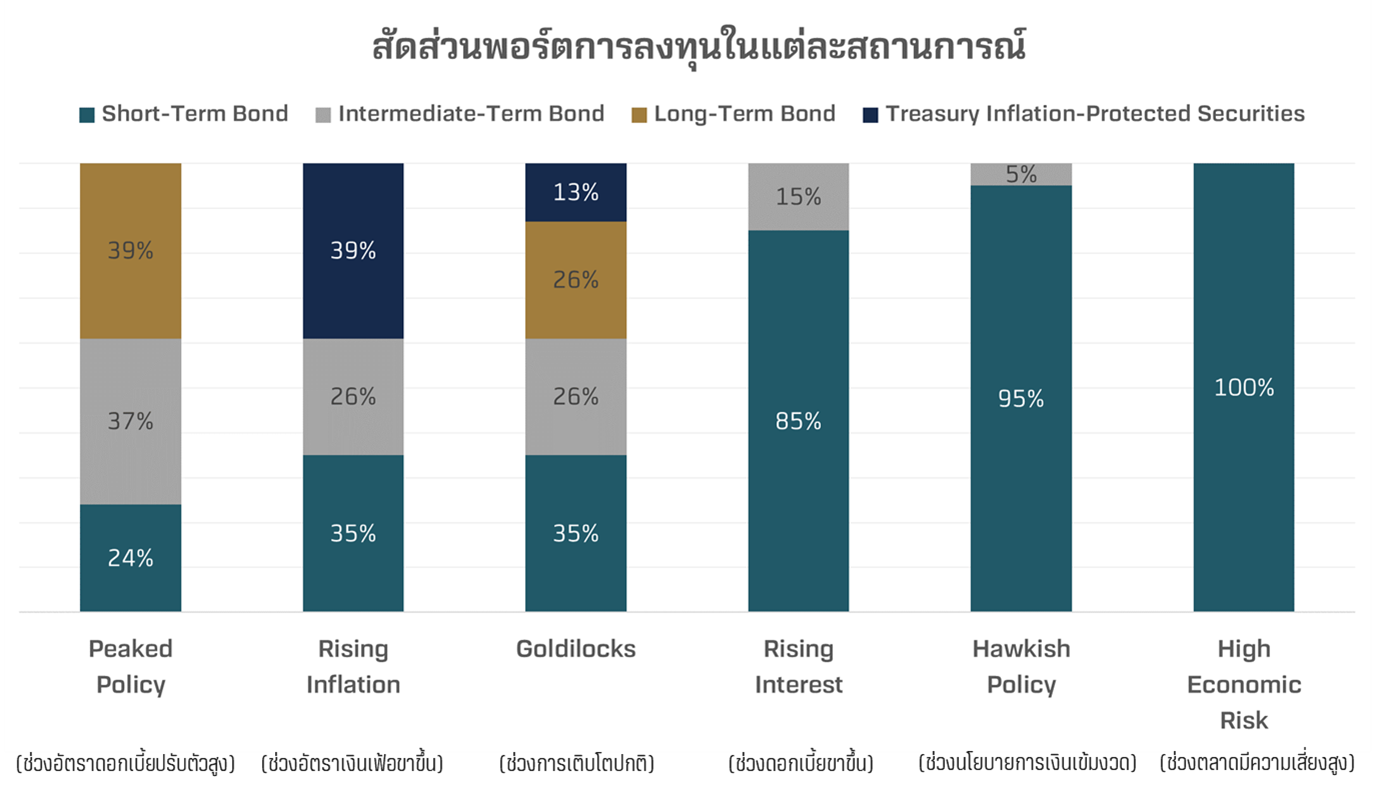 ทั้งนี้ Bond ETF จำแนกออกเป็นหลายประเภท เช่น แบ่งตามอายุคงเหลือ แบ่งตามอันดับความน่าเชื่อถือ แบ่งตามอุตสาหกรรมของผู้ออกตราสารหนี้ เป็นต้น ทำให้นักลงทุนอาจต้องใช้ระยะเวลานานในการทำความเข้าใจลักษณะของตราสาร รวมไปถึงการจัดพอร์ตและปรับเปลี่ยนสัดส่วนการลงทุนให้สอดคล้องกับสภาวะเศรษฐกิจ ซึ่งจากรูปแสดงตัวอย่างผลตอบแทนจากการลงทุนใน Bond ETF แต่ละประเภท หากลงทุนเฉพาะ ETF ตราสารหนี้ระยะสั้น (Short-Term Bond) ก็จะได้ผลตอบแทนที่สม่ำเสมอและมีความเสี่ยงต่ำ แต่ผลตอบแทนโดยรวมน้อย ในทางกลับกันหากลงทุนเฉพาะ ETF ตราสารหนี้ระยะยาว (Long-Term Bond) ก็จะมีโอกาสได้ผลตอบแทนที่สูงมากในบางช่วง แต่มีความผันผวนมากและมีความเสี่ยงที่จะขาดทุนได้มากในบางช่วงเช่นกัน และถึงแม้ว่าจะกระจายการลงทุนแบบถ่วงน้ำหนักเท่ากัน (Equal Weighted) จะช่วยเฉลี่ยผลตอบแทนและความผันผวนจากตราสารหนี้แต่ละประเภทได้ในระดับหนึ่ง แต่จะดีกว่าไหมถ้ามีผู้เชี่ยวชาญคอยปรับสัดส่วนการลงทุนให้สอดคล้องกับสภาวะเศรษฐกิจ เช่น ถือตราสารหนี้ระยะยาวในสัดส่วนที่มากขึ้น เพื่อเพิ่มผลตอบแทนช่วงที่อัตราดอกเบี้ยเป็นขาลง หรือเน้นถือตราสารหนี้ระยะสั้นในช่วงที่เศรษฐกิจมีความเสี่ยงสูงเพื่อลดความผันผวนและรับผลตอบแทนที่ค่อนข้างแน่นอน เป็นต้น