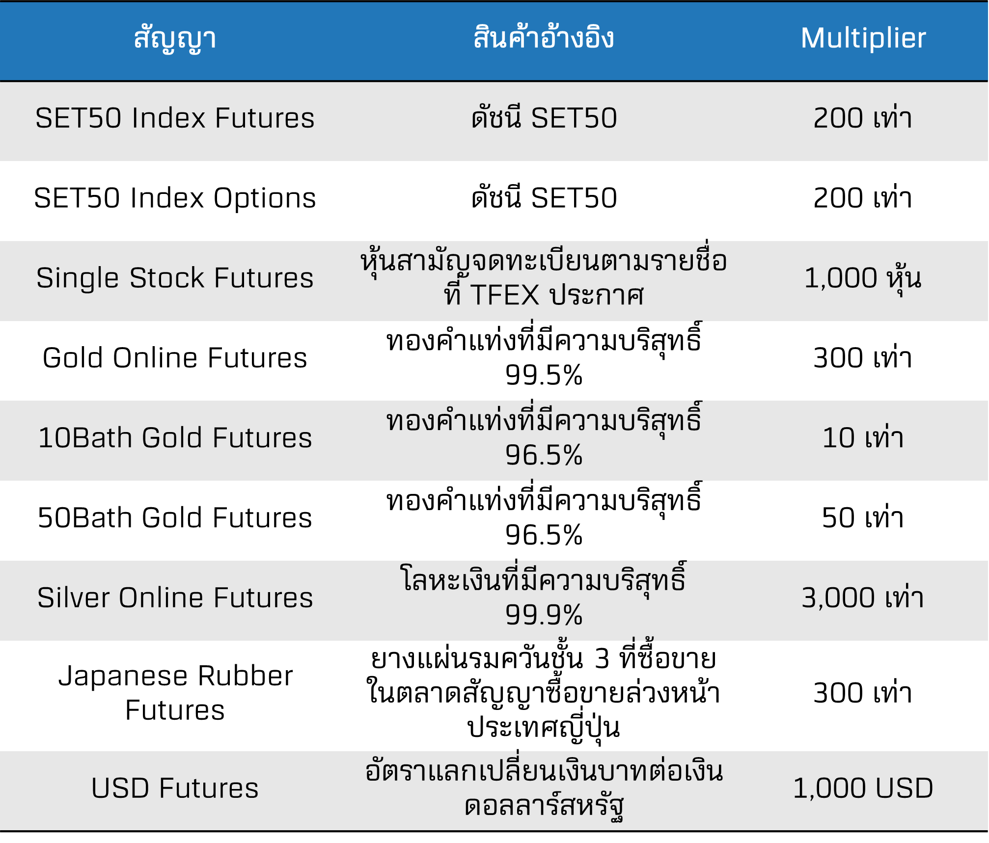 สินค้าในตลาด TFEX จะมีตัวคูณ (Multiplier) ที่แตกต่างกันไป ตามแต่ละสินค้าอ้างอิงและลักษณะสัญญาดังตารางด้านล่าง