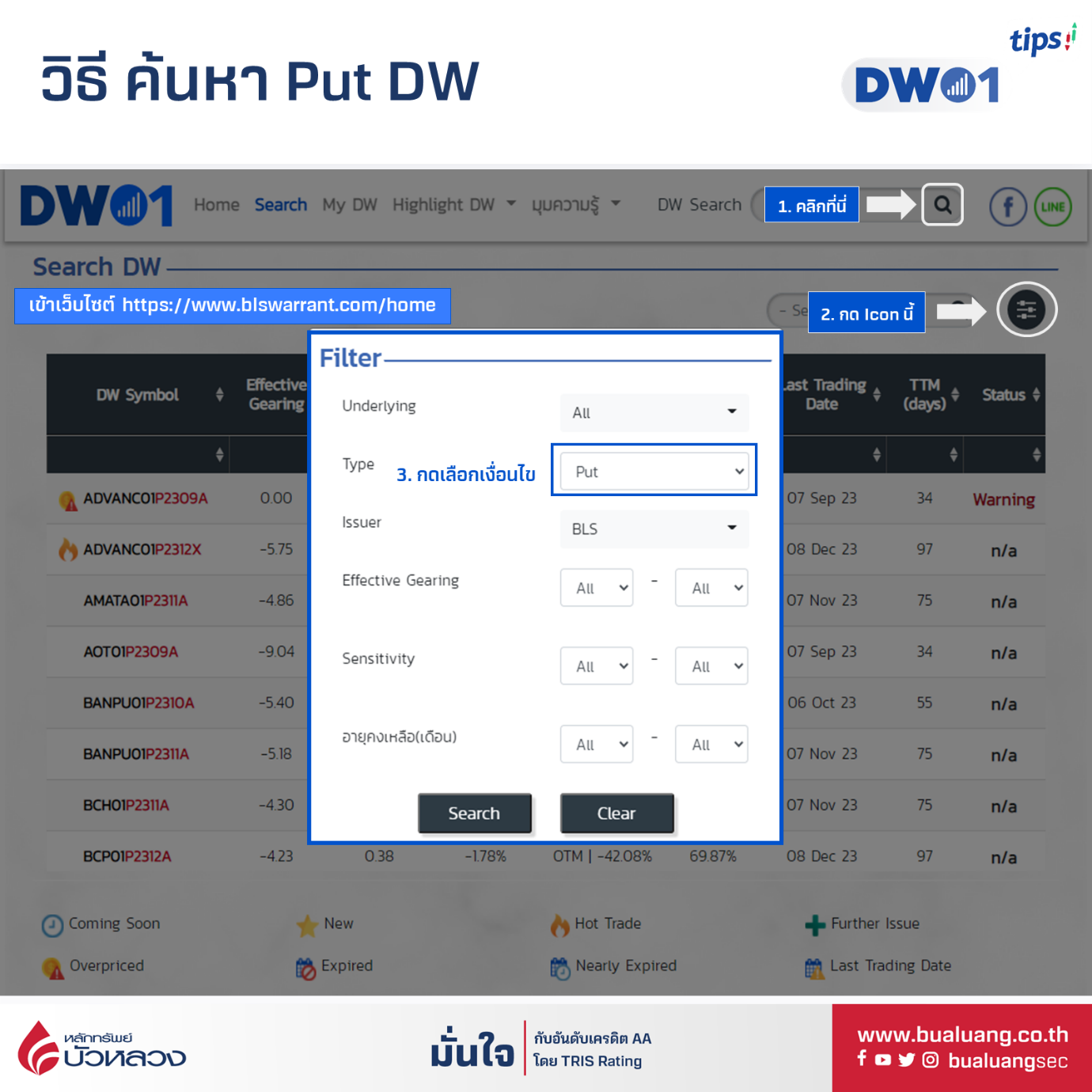 นักลงทุนสามารถเข้าที่ www.blswarrant.com แล้วเลือกเมนู search จากนั้น กดที่ icon บนขวา แล้วเลือก Filter type เป็น Put จากนั้นกด search จะนำท่านไปสู่ลิส Put DW01 ทั้งหมดที่มีในตลาด ณ ขณะนั้น โดยสามารถกดที่ชื่อ Put DW01 เพื่อเข้าถึงตารางราคาพร้อมวางแผนเทรดได้ทันที