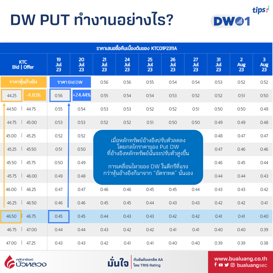 ยกตัวอย่างเช่นสมมติเราเชื่อว่าหุ้น KTC จะปรับตัวลงจาก 46.50 บาท เป็น 44.25 บาท (ดูที่ราคา Bid) หรือปรับตัวลงมา -4.83% หากดูจากตารางราคาจะเห็นว่า ราคา KTC01P2311A (Put DW อ้างอิงหุ้น KTC) จะปรับจาก 0.45 บาท ขึ้นเป็น 0.56 บาท หรือเพิ่มขึ้น +24.44% นั่นเอง คือ ราคา Put DW จะเคลื่อนไหวสวนทางราคาหุ้นอ้างอิง
