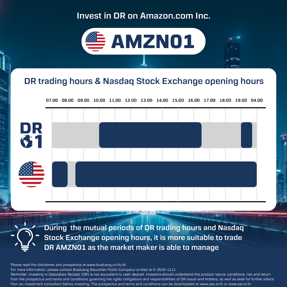 The price of AMZN01 tends to move along with the price of AMZN in the long term. The suitable time for investing in AMZN01 is during the overlapping trading hours of the Thai stock market and Nasdaq, as well as during Nasdaq’s after-hours session, which is from 10:00 a.m. - 4:30 p.m. and 7:00 p.m. – 3:00 a.m. Thailand time.
