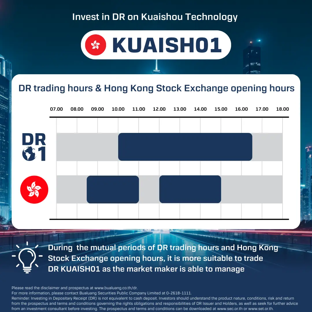 Please be informed that during Hong Kong Stock Exchange’s closing period, DR KUAISH01 may have less liquidity than when Hong Kong and Thai Stock Exchange open at the same time.