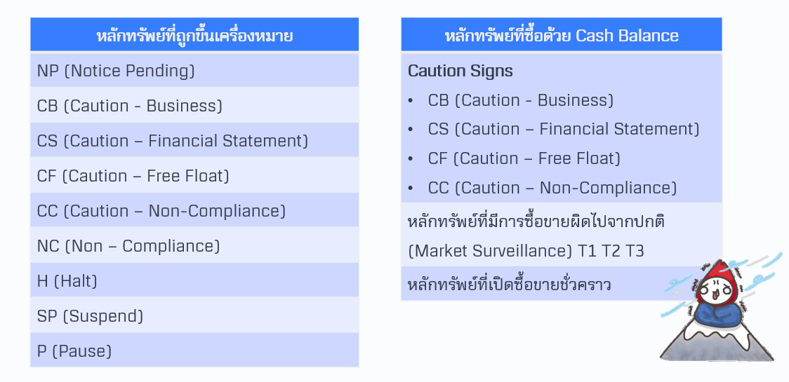 หากหุ้นมีการขึ้นเครื่องหมายดังนี้จะแสดงว่า บริษัทเริ่มมีปัญหาเรื่องการเงิน หรือมีคุณสมบัติไม่เป็นไป ตามเกณฑ์ที่กำหนด โดยซื้อได้เฉพาะบัญชี Cash Balance เท่านั้น