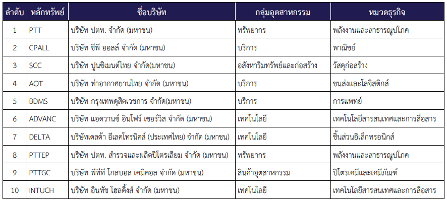 หุ้นที่มีน้ำหนักสูงที่สุดอย่าง PTT หรือบริษัท ปตท. จำกัด(มหาชน) ดำเนินธุรกิจสำรวจและผลิตก๊าซธรรมชาติ ปิโตรเคมี น้ำมันรวมถึงการค้าด้านพลังงานทั้งในและต่างประเทศ เรียกได้ว่า ปตท. เป็นบริษัทยักษ์ใหญ่ที่สุดแห่งหนึ่งในไทย ด้วยความที่ประกอบธุรกิจที่น้อยคนสามารถทำได้ ต้องการการลงทุนที่มหาศาล ทำให้ ปตท. เป็นเบอร์ 1 ในตลาดทั้งยังเป็นรัฐวิสาหกิจที่สร้างรายได้เข้าคลังของประเทศได้มากที่สุดเป็นอันดับต้น ๆ ด้วยนะอันดับที่สอง CPALL หรือบริษัท ซีพี ออลล์ จำกัด(มหาชน) ดำเนินธุรกิจเกี่ยวกับร้านสะดวกซื้ออันเป็นที่รู้จักคือ “7-Eleven” นอกเหนือจากนี้ยังดำเนินธุรกิจเกี่ยวกับการศึกษา อีคอมเมิร์ซ อาหารสำเร็จรูป ทั้งยังเป็นเจ้าของธุรกิจค้าส่งขนาดใหญ่และซุปเปอร์มาเก็ตอย่าง Makro และ Lotus ด้วยนะ เรียกได้ว่าเป็นหุ้นที่อยู่ใกล้ตัวนักลงทุนเรามากๆเลย