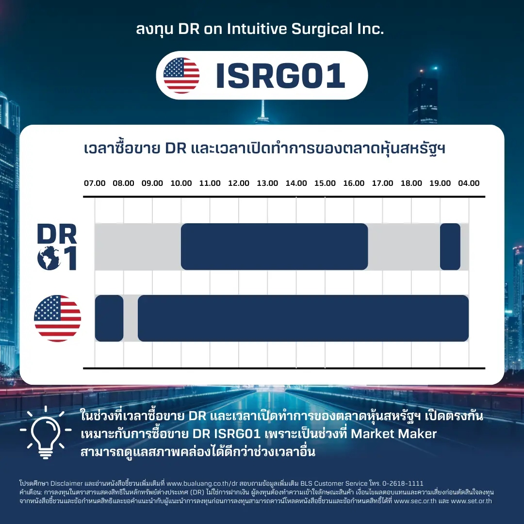 ในช่วงตลาดหุ้นสหรัฐฯ ปิดทำการ อาจส่งผลให้ DR ISRG01 ที่จดทะเบียนในตลาดหุ้นไทย มีสภาพคล่องน้อยกว่าในช่วงที่ตลาดหุ้นไทยและสหรัฐฯ เปิดทำการพร้อมกัน