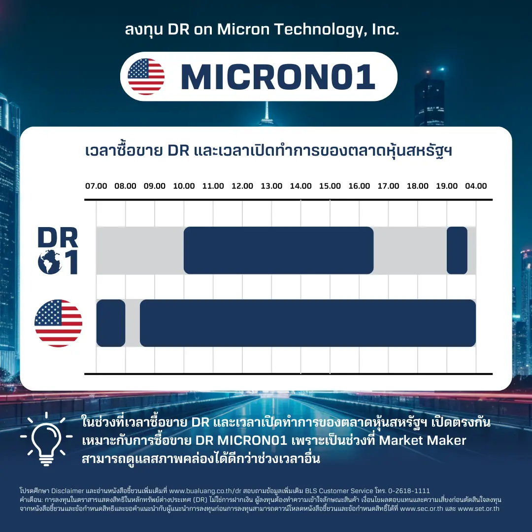ในช่วงตลาดหุ้นสหรัฐฯ ปิดทำการ อาจส่งผลให้ DR MICRON01 ที่จดทะเบียนในตลาดหุ้นไทย มีสภาพคล่องน้อยกว่าในช่วงที่ตลาดหุ้นไทยและสหรัฐฯ เปิดทำการพร้อมกัน